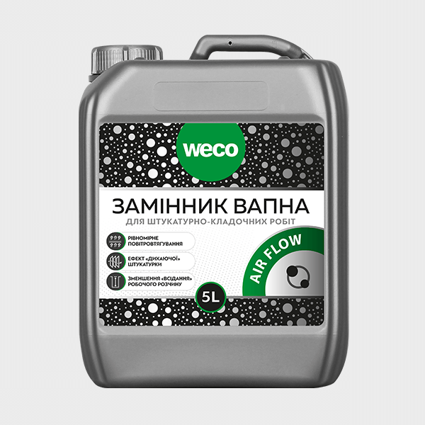 Заменитель извести "AIR FLOW" ТМ "WECO" во время замешивания образует большое количество закрытых пор в структуре раствора, которые уменьшают водопоглощение и водонепроницаемость материала. Позволяет удешевить стоимость раствора. Материал улучшает пластичность бетона, предупреждает расслоение раствора, сохраняет вязкость и подвижность материала во время работы. Добавка делает покрытие устойчивым к морозам. Создает эффект «дышащей штукатурки». Предотвращает появление высолов, образованию трещин, пятен, не вызывает коррозии металлических элементов.