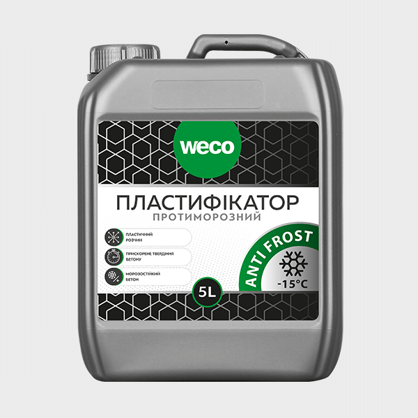 Пластификатор "ПРОТИВОМОРОЗНЫЙ" ТМ "ВЕКО" ("ANTI FROST" ТМ "WECO») - это универсальная бесхлорная добавка, которая используется при проведении любых работ по бетонированию (устройство стяжек, монолитного строительства, кладки и т.п.) при низких температурах окружающей среды от 5 °С до -15 °С. Применяют для всех видов бетона, растворных смесей и сухих строительных смесей.
