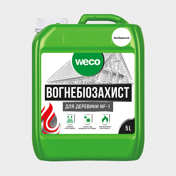 Вогнебіозахист для деревини “NF-1” (Безбарвний) ТМ “WECO” (“НФ-1” ТМ “ВЕКО”) – це просочення з вмістом антипіренів та інгібіторів біокорозії деревини. Застосовується для деревяних конструкцій та виробів з деревини (стропильні системи дахів, крокви, балки, несучі конструкції дерев'яних будинків). Придатний для промислового та професійного використання.